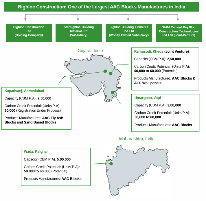 Incorporated in 2015, BIGBLOC Construction Ltd is one of the largest and only listed AAC block manufacturer in India, with a 1.3 million CBM annual capacity across plants in Gujarat (Kheda, Umargaon, Kapadvanj) and Maharashtra (Wada). The company, which markets its products under the ‘NXTBLOC’ brand, is one of the few in the AAC industry to generate carbon credits. With over 2,000 completed projects and 1,500+ in the pipeline, The company’s clients include Lodha, Adani Realty, IndiaBulls Real Estate, DB Realty, Prestige, Piramal, Oberoi Realty, Tata Projects, Shirke Group, Shapoorji Pallonji Group, Raheja, PSP Projects, L&T, Sunteck, Dosti Group, Purvankara Ltd, DY Patil, Taj Hotels, Godrej Properties, Torrent Pharma, GAIL among others.