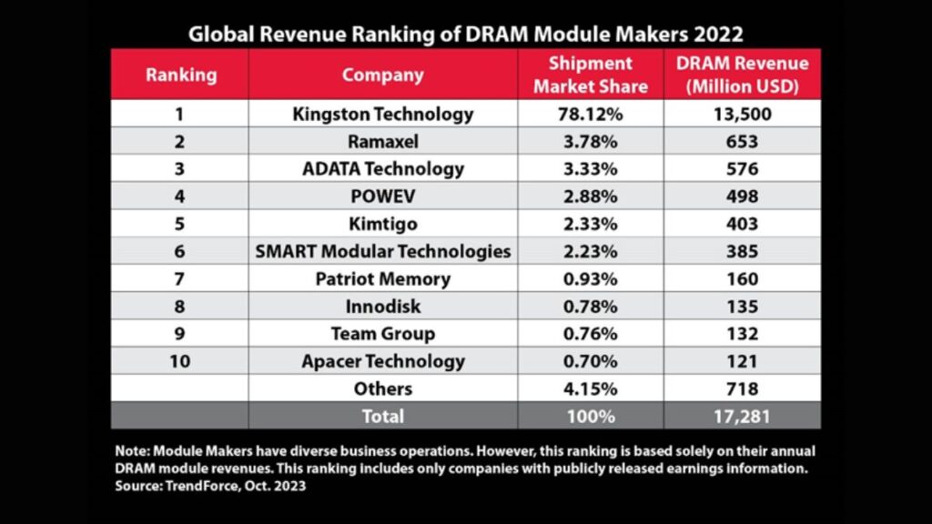 According to the report, the world’s top five memory module houses accounted for 90% of total sales in 2022, with Kingston maintaining its dominant market share of 78.12%. Consumer buying trends for electronic products took a hit from high inflation, but Kingston’s robust brand scale, along with its comprehensive product supply chain, limited its decline, keeping it firmly at the top of market share rankings.